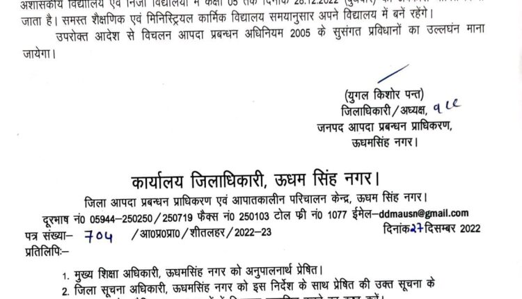 रूद्रपुर। जिलाधिकारी युगल किशोर पंत ने बताया कि शीतलहर के दृष्टिगत भारत मौसम विज्ञान विभाग, मौसम विज्ञान केन्द्र, देहरादून द्वारा उत्तराखण्ड के लिए दिनांक 27.12.2022 से 31.12.2022 तक 05 दिनों का मौसम पूर्वानुमान के द्वारा दिनांक 28.12.2022 को ओरेन्ज अलर्ट जारी किया गया हैं।