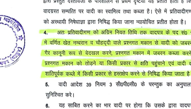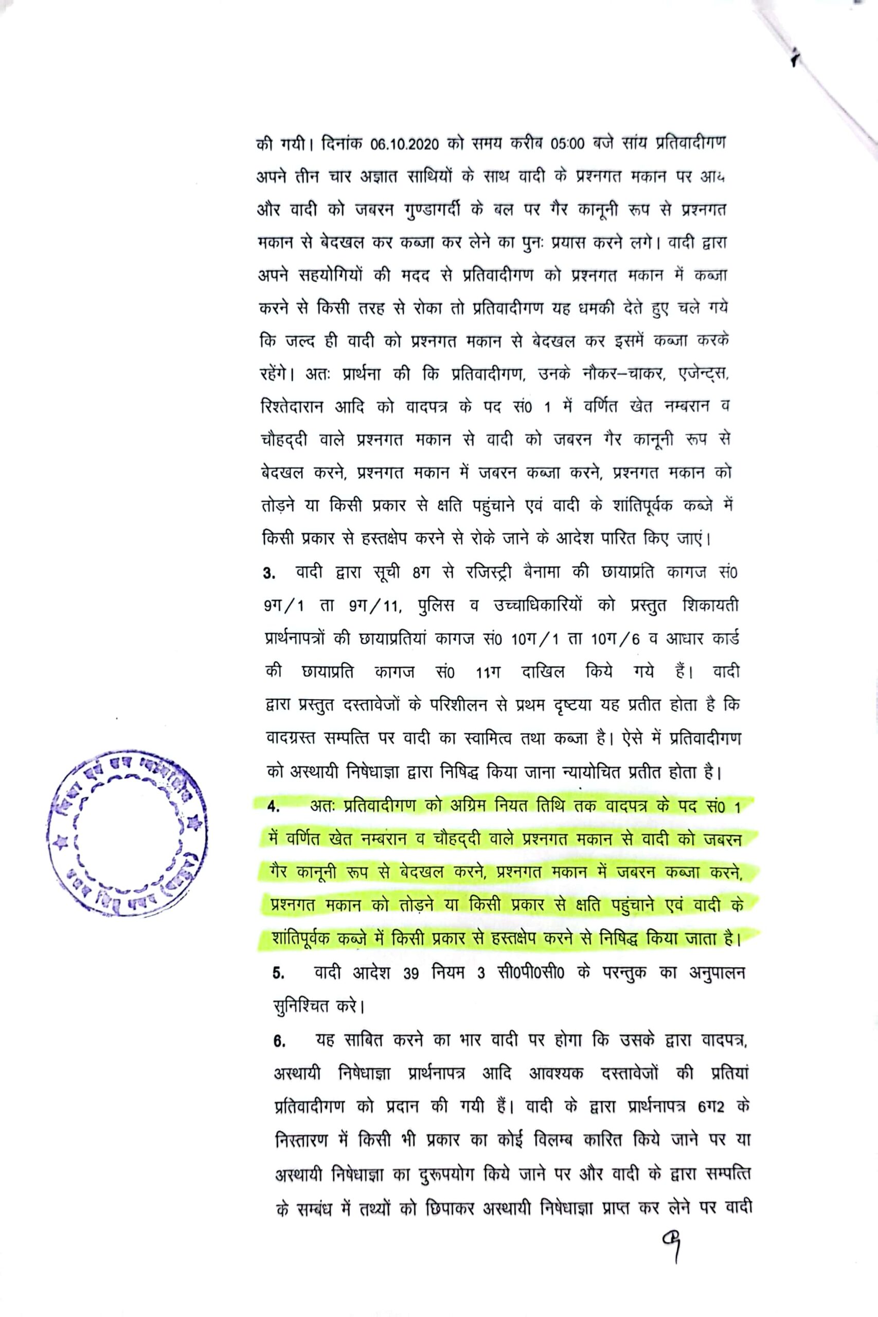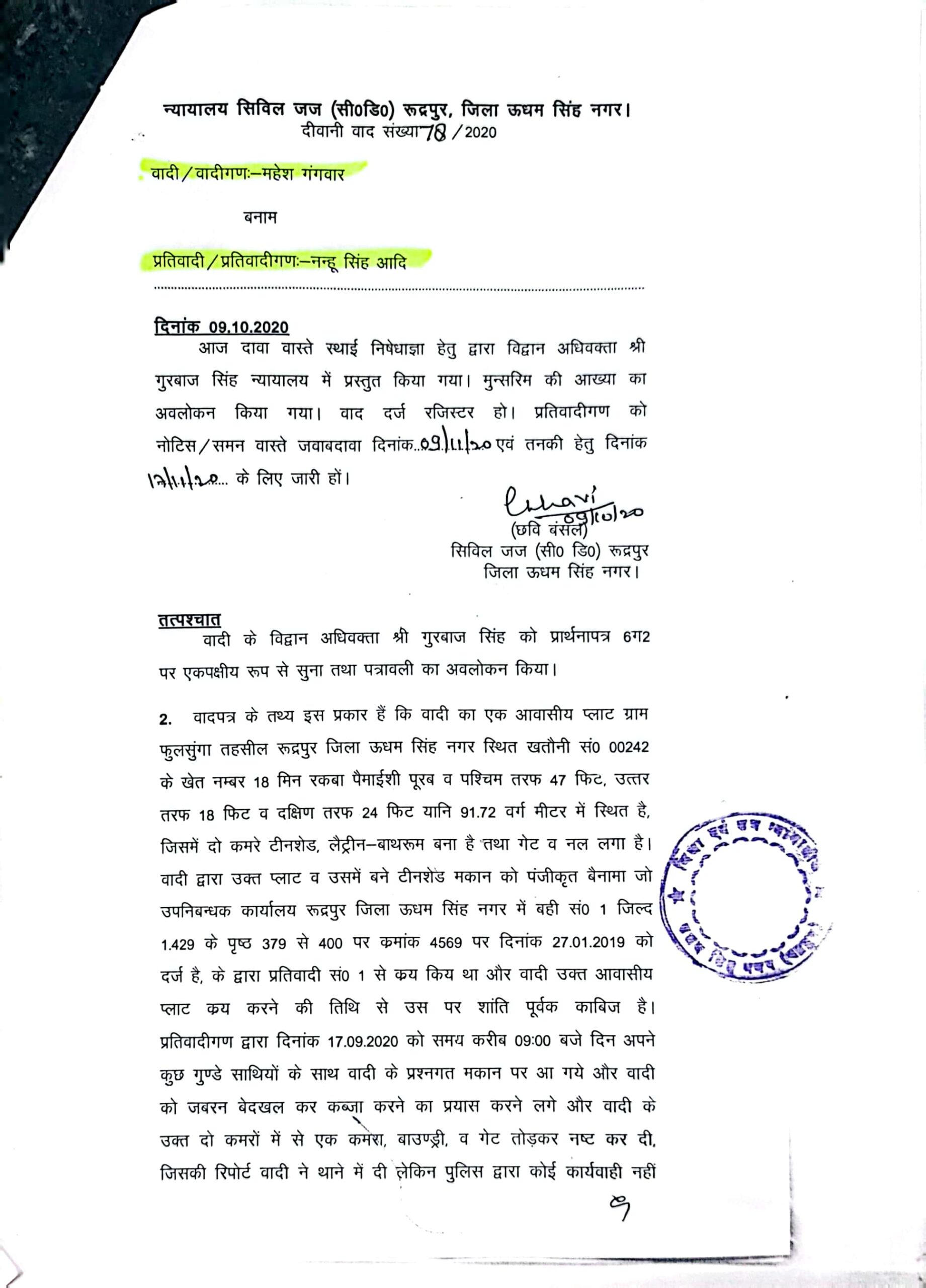 महेश गंगवार ने बताया कि सिविल जज सीनियर डिविजन रुद्रपुर के न्यायालय से सिविल वाद संख्या 78/ 2020 महेश गंगवार बनाम नन्हू सिंह, जागन लाल आदि में मेरे पक्ष में स्टे ऑर्डर जारी है जिसमें नन्हू पाल, जागन लाल और उनके साथियों को न्यायालय द्वारा मेरे मकान में कब्जा करने, मकान को तोड़ने या मुझे बेदखल करने से रोके जाने का आदेश पारित किया गया है।