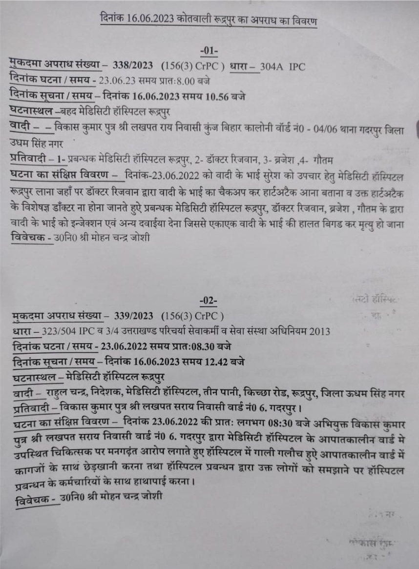 आपको बता दें कि गदरपुर निवासी विकास कुमार ने मेडिसिटी अस्पताल के चिकित्सक रिजबान, ब्रजेश और गौतम पर दर्ज कराए केस में कहा कि 22 जून 2022 की रात को उसके भाई के सीने में दर्द उठा था।
