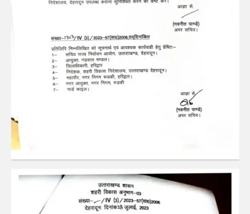 उन्होंने अग्रिम आदेशों तक हरिद्वार डीएम धीराज सिंह गर्ब्याल को उत्तर प्रदेश नगर निगम अधिनियम 1959 की धारा-100 के अंतर्गत विहित अधिकारी नामित किया है।