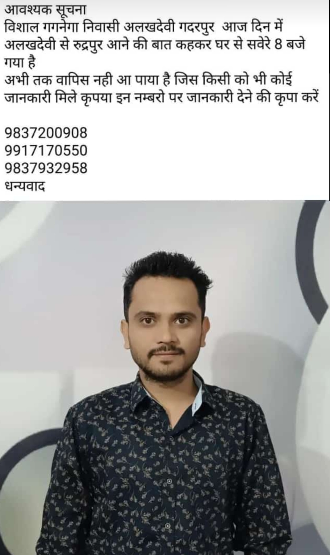गदरपुर निवासी महिला ने कोतवाली पुलिस को तहरीर सौंप गुमशुदगी दर्ज कराई है। तहरीर में कहा है कि उसका पुत्र विशाल गगनेगा 29 जुलाई को सुबह करीब 8 बजे यह कहकर घर से गया, कि वह रुद्रपुर जा रहा है।