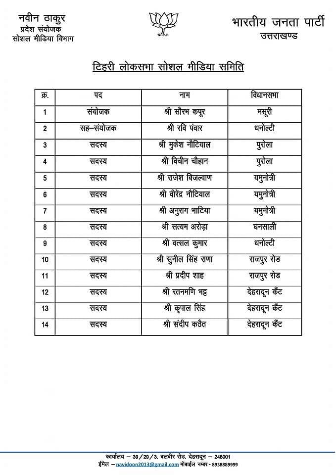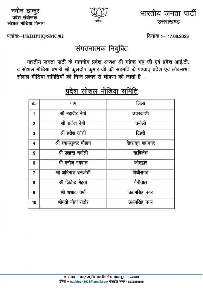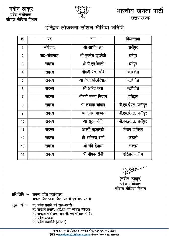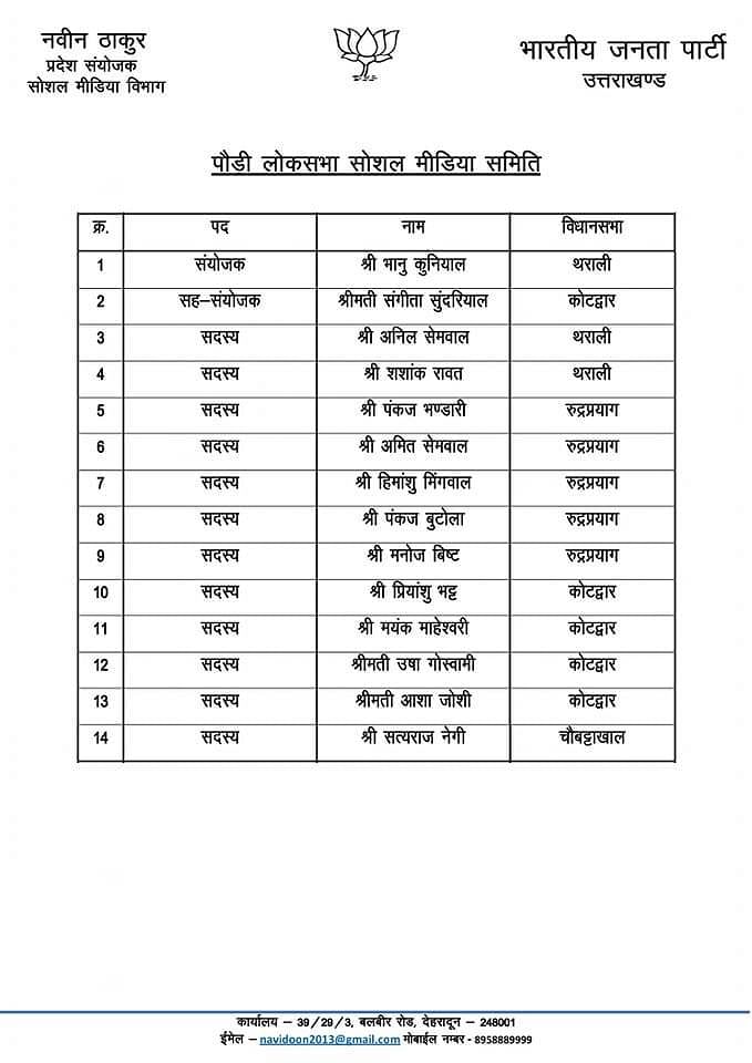 लोकसभा चुनाव : उत्तराखंड भाजपा ने किया प्रदेश और लोकसभा सोशल मीडिया समितियों का गठन, यहां देखें लिस्ट।