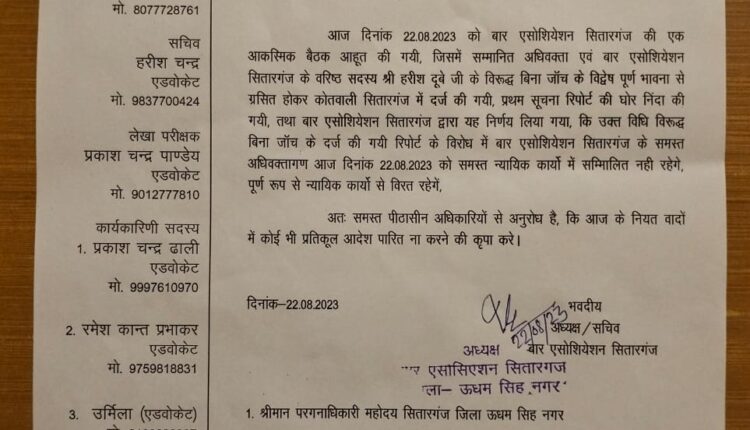 सितारगंज बार एसोसिएशन द्वारा कड़ा एतराज जताते हुए मंगलवार को पुलिस की कार्यवाही के विरोध में कार्य बहिष्कार का एलान किया है।