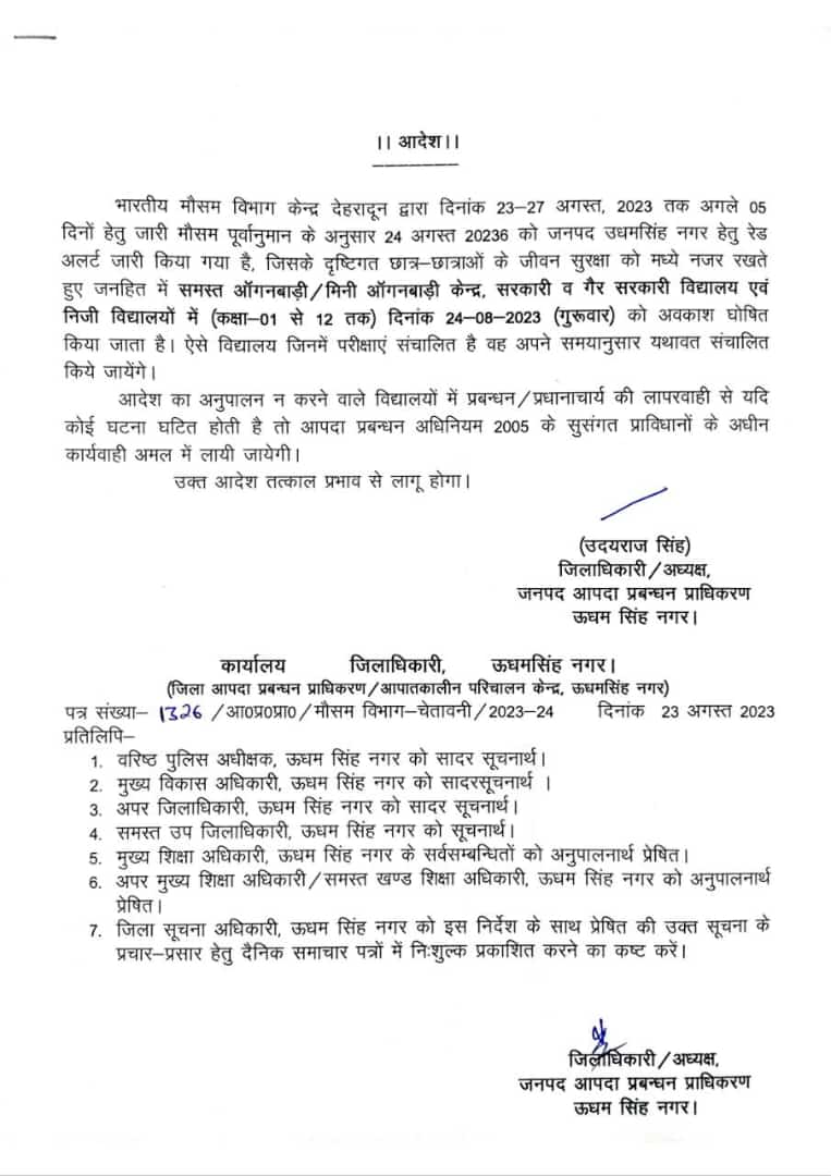 जिसके दृष्टिगत जिलाधिकारी उदयराज सिंह ने छात्र / छात्राओं के जीवन सुरक्षा को मध्य नजर रखते हुये जनहित में समस्त ऑगनबाड़ी / मिनी ऑगनबाडी केन्द्र, सरकारी व गैर सरकारी विद्यालय एवं निजी विद्यालयों में (कक्षा 01 से 12 तक) दिनांक 24-08-2023 (बृहस्पतिवार) को अवकाश घोषित किया जाता है।