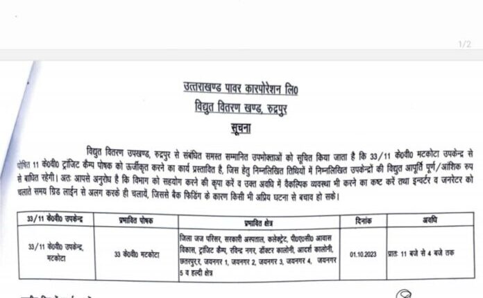 रूद्रपुर क्षेत्र में रविवार को बिजली कटौती का आदेश जारी किया गया है। अधिशासी अभियंता विद्युत वितरण खंड रुद्रपुर द्वारा 30 सितंबर को आदेश जारी कर कहा गया है कि 33/11 के.वी. मटकोटा उपकेंद्र से पोषित 11 के. वी. ट्रांजिट कैंप पोषक को ऊर्जीकृत करने का कार्य प्रस्तावित है जिसके लिए 1 अक्टूबर 2023 को उपकेंद्रों की विद्युत आपूर्ति पूर्ण एवं आंशिक रूप से बाधित रहेगी।
