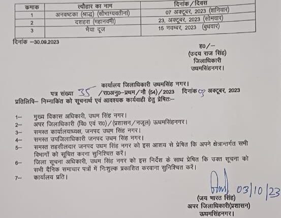 उधमसिंह नगर जिले में शनिवार को अवकाश घोषित। ऊधमसिंह नगर By MEDIA GROUP On Oct 5, 2023 Share मीडिया ग्रुप, 05 अक्टूबर, 2023 रुद्रपुर। उधमसिंह नगर के जिलाधिकारी उदयराज सिंह ने जिले में 7 अक्टूबर को बैंक / कोषागार को छोड़ अन्य सभी कार्यालयों में अनवष्टका (श्राद्ध) का अवकाश घोषित किया है।