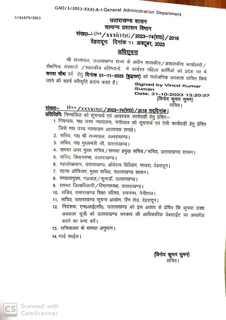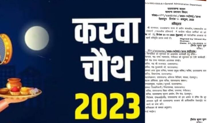 करवा चौथ पर उत्तराखंड सरकार ने महिला कर्मचारियों को तोहफा दिया है। राज्यपाल गुरमीत सिंह ने शासकीय, अशासकीय कार्यालयों व शिक्षा संस्थानों में महिला कर्मचारियों के लिए एक नवंबर को सार्वजनिक अवकाश घोषित किया है। मंगलवार दोपहर सचिव विनोद कुमार सुमन ने इसके आदेश भी जारी कर दिए हैं।