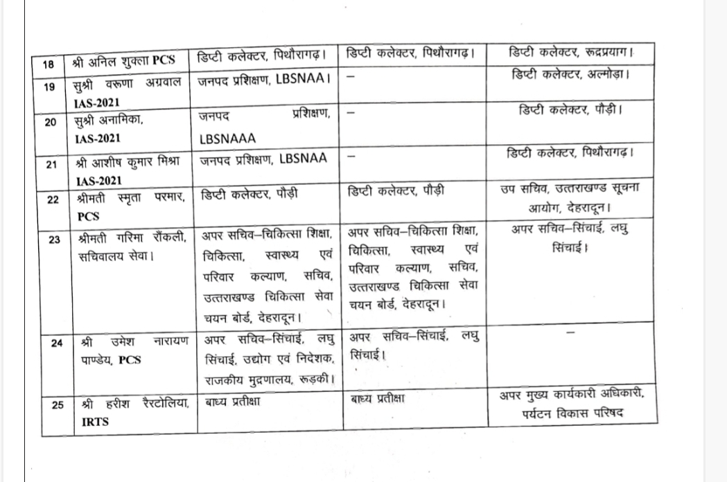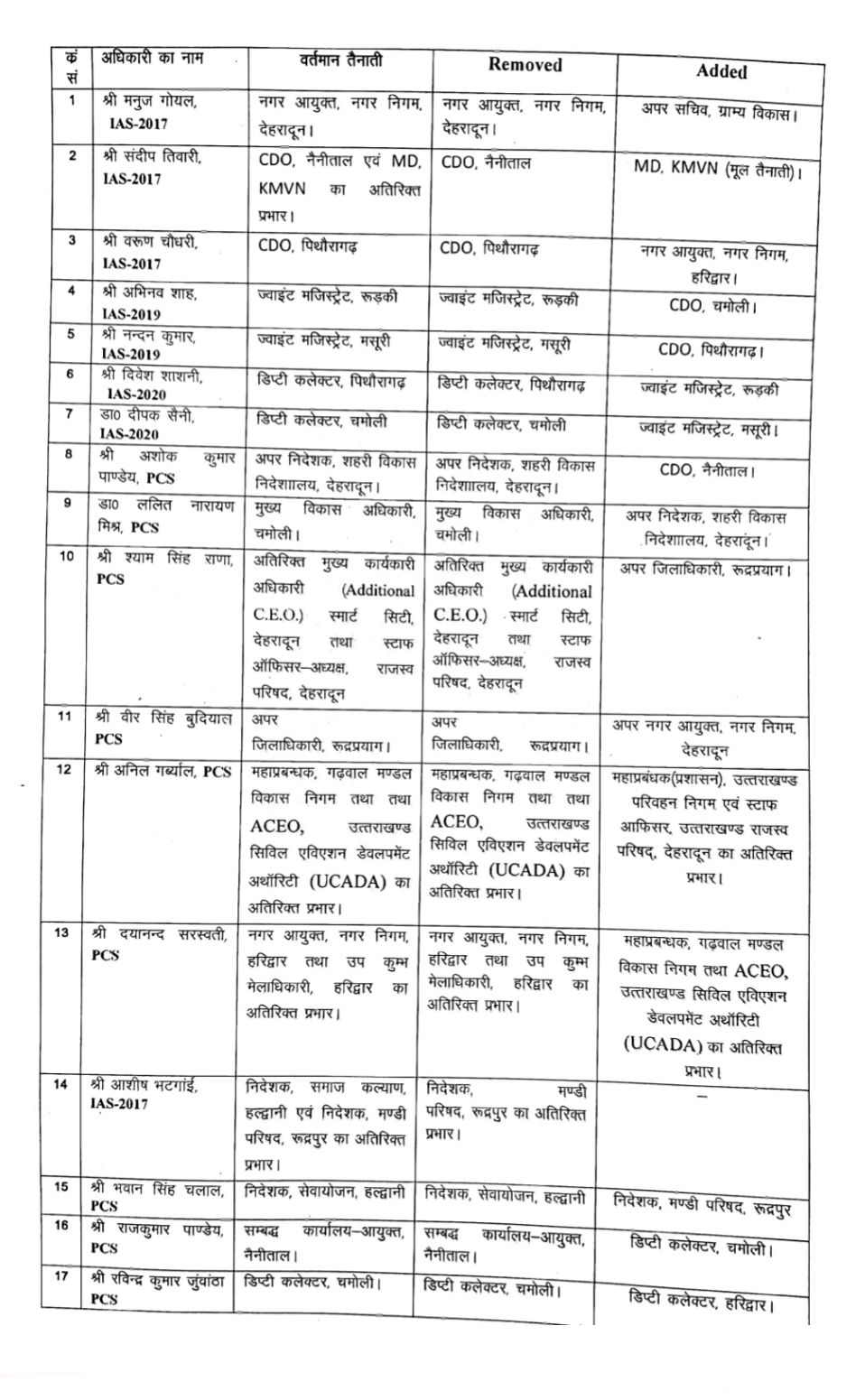 उत्तराखंड : आईएएस और पीसीएस अधिकारियों के ट्रांसफर। उत्तराखंड By MEDIA GROUP On Nov 22, 2023 Share मीडिया ग्रुप, 22 नवंबर, 2023 उत्तराखंड शासन ने बुधवार को बड़ा प्रशासनिक फेरबदल किया। 11 आईएएस समेत 25 अफसरों का तबादला कर दिया गया है। बुधवार को सचिव कार्मिक शैलेश बगोली ने इसका आदेश भी जारी कर दिया है।