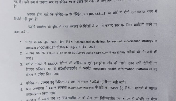 भारत सरकार की तरफ से एडवाइजरी जारी होने के बाद उत्तराखंड के स्वास्थ्य विभाग ने कोरोना वायरस के नए वैरिएंट JN.1 (BA.2.86.1.1) से बचाव और रोकथाम के लिए कुछ दिशा-निर्देश जारी किए है।