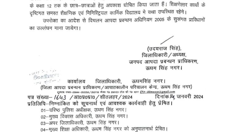 उक्त कारणों से विद्यालयों में जाने वाले छात्र-छात्राओं के जीवन को आसन्न खतरे के दृष्टिगत दिनांक 15 जनवरी 2024 एवं दिनांक 16 जनवरी, 2024 तक (02 दिन) जनपद के समस्त ऑगनवाड़ी केन्द्र, शासकीय, अर्द्धशासकीय, सरकारी सहायता प्राप्त एवं निजी विद्यालयों के कक्षा 12 तक के छात्र-छात्राओं हेतु अवकाश घोषित किया जाता है।