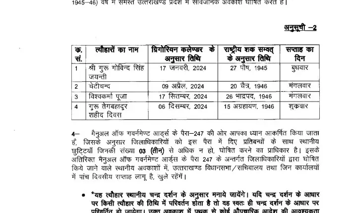 उत्तराखंड : बुधवार को सार्वजनिक अवकाश घोषित उत्तराखंड By MEDIA GROUP On Jan 16, 2024 Share उत्तराखंड में बुधवार (17 जनवरी, 2024) को श्री गुरु गोविंद सिंह जयंती के अवसार पर सार्वजनिक अवकाश घोषित किया गया है।