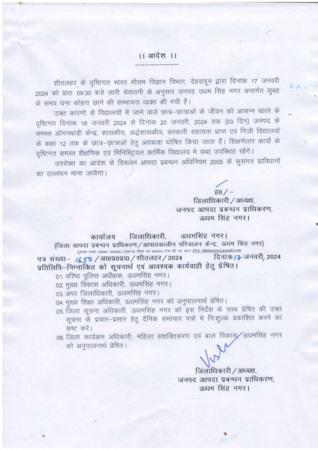 उक्त कारणो से विद्यालयों में जाने वाले छात्र-छात्राओं के जीवन को आसन्न खतरे के दृष्टिगत दिनांक 18 जनवरी 2024 से दिनांक 20 जनवरी, 2024 तक (03 दिन) जनपद के समस्त ऑगनबाडी केन्द्र, शासकीय, अर्द्धशासकीय, सरकारी सहायता प्राप्त एवं निजी विद्यालयों के कक्षा 12 तक के छात्र-छात्राओं हेतु अवकाश घोषित किया जाता है। शिक्षणेत्तर कार्यों के दृष्टिगत समस्त शैक्षणिक एवं मिनिस्ट्रियल कार्मिक विद्यालय में यथा उपस्थित रहेंगे।