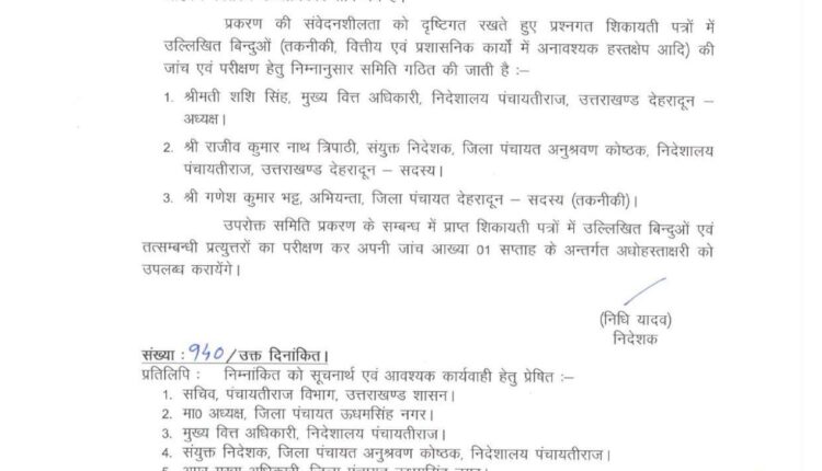 जांच कमेटी में मुख्य वित्त अधिकारी पंचायतीराज शशि सिंह, संयुक्त निदेशक जिला पंचायत अनुश्रवण कोष्ठक राजीव कुमार नाथ त्रिपाठी, अभियंता जिला पंचायत देहरादून गणेश कुमार भट्ट को सदस्य बनाया गया है।