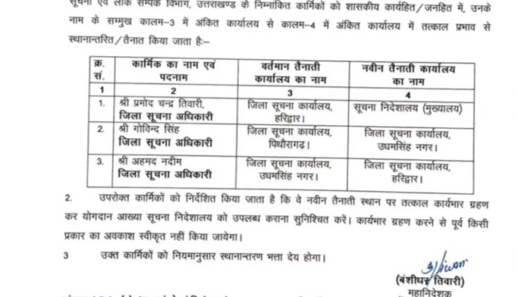 उत्तराखंड सूचना एवं लोक सम्पर्क विभाग के महानिदेशक बंशीधर तिवारी की ओर से सोमवार को जिला सूचना अधिकारियों के ट्रांसफर लिस्ट जारी की गई। ट्रांसफर की जारी सूची के अनुसार उधमसिंह नगर जिला सूचना अधिकारी अहमद नदीम सहित 3 अधिकारियों के ट्रांसफर किए हैं। अहमद नदीम की जगह पिथौरागढ़ जनपद से गोविंद सिंह को उधमसिंह नगर के नए जिला सूचना अधिकारी के पद पर ट्रांसफर किया गया है।