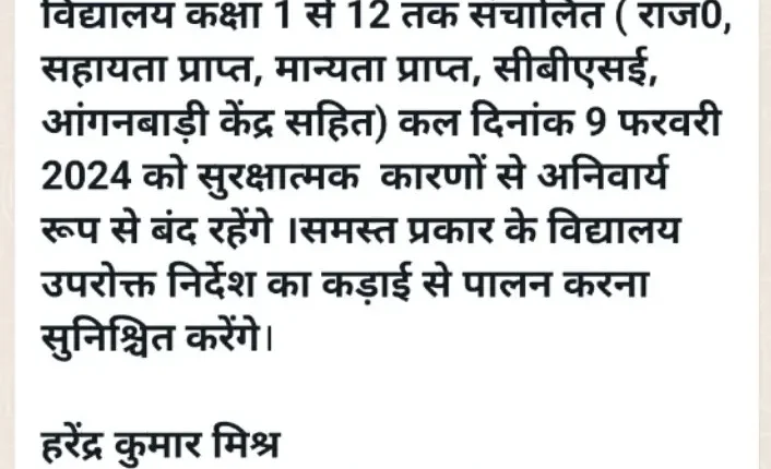 उत्तराखंड। हल्द्वानी में कर्फ्यू के आदेश के बाद हरेंद्र कुमार मिश्र, खंड शिक्षा अधिकारी : हल्द्वानी ने हल्द्वानी विकास खंड के समस्त प्रकार के स्कूल ( राजकीय सहायता प्राप्त, मान्यता प्राप्त, सीबीएसई, आंगनबाड़ी केंद्र, सहित) में कक्षा 1 से 12 तक दिनांक 9 फरवरी 2024 को अवकाश का आदेश जारी किया है। उन्होंने कहा कि समस्त प्रकार के विद्यालय उपरोक्त निर्देश का कड़ाई से पालन करना सुनिश्चित करेंगे।