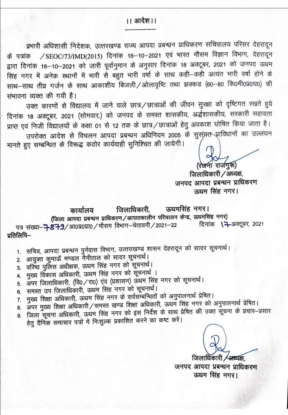 जिलाधिकारी ने विद्यालय में जाने वाले छात्र-छात्राओं की जीवन सुरक्षा को दृष्टिगत रखतें हुए 18 अक्टूबर 2021 (सोमवार) को जनपद के समस्त शासकीय, अर्द्धशासकीय व सरकारी सहायता प्राप्त एवं निजी विद्यालयों के कक्षा 1 से 12 तक के छात्र-छात्राओं हेतु अवकाश घोषित किया है।