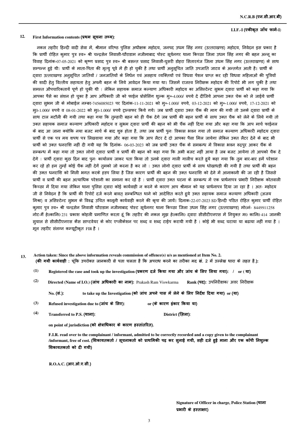 बीते शनिवार को धौराडाम नजीमाबाद निवासी रोहित कुमार ने एसएसपी को तहरीर देकर बताया था कि उसने अपनी बहन अन्नू का विवाह सात मई 2021 को घुसरी डोहरा सितारगंज निवासी कृष्ण प्रसाद के साथ किया था। उसके माता-पिता की मृत्यु पूर्व में ही हो चुकी है और वह जाटव (अनुसूचित जाति) के अंतर्गत आता है। उसने बहन की शादी में वित्तीय सहायता के लिए आवेदन किया था। इसमें राजस्व निरीक्षक की रिपोर्ट सहित औपचारिकताएं पूरी हो चुकी थीं।