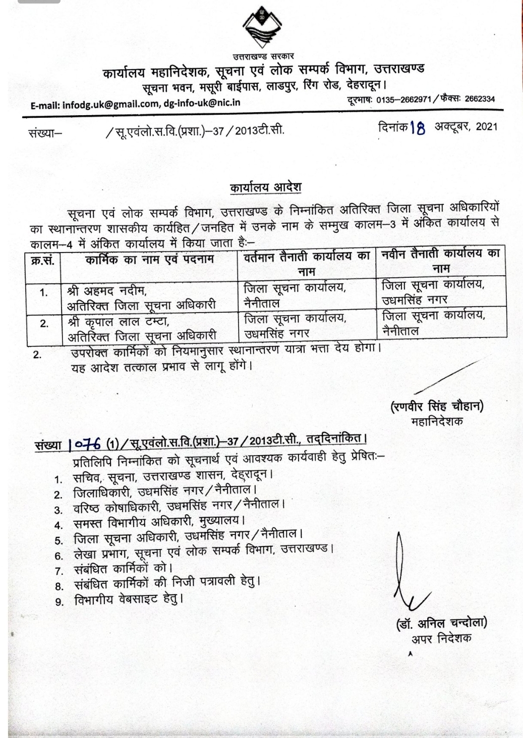 महानिदेशक सूचना एवं लोक संपर्क विभाग देहरादून द्वारा अब अपर जिला सूचना अधिकारी उधम सिंह नगर का ट्रांसफर नैनीताल जनपद में किए जाने का आदेश जारी किया गया है जिस सम्बन्ध में महानिदेशक सूचना व लोक संपर्क विभाग के कार्यालय पत्रांक दिनांक 18 अक्टूबर 2021 जारी कर ट्रांसफर के आदेश पारित किए गए।