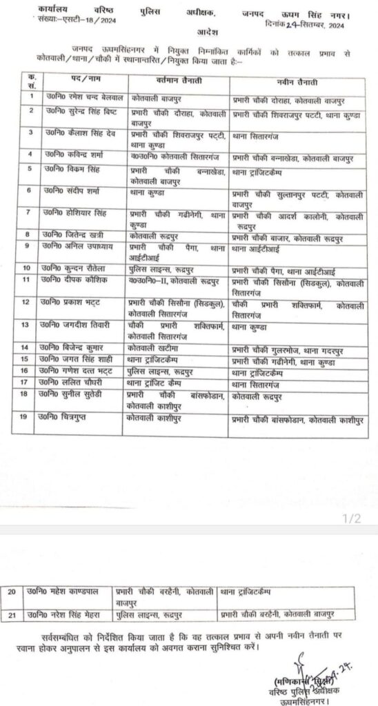 बड़ी खबर: उधमसिंह नगर में एसएसपी ने किए 21 पुलिस अधिकारियों के तबादले, आदर्श कॉलोनी चौकी इंचार्ज भी शामिल