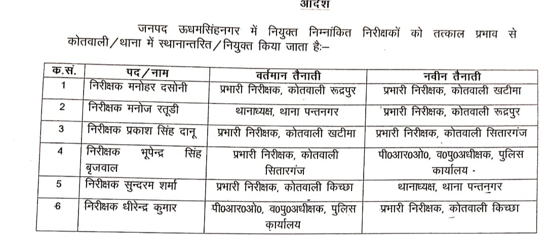 5. निरीक्षक सुंदरम शर्मा – वर्तमान प्रभारी निरीक्षक, कोतवाली किच्छा, अब थानाध्यक्ष, थाना पंतनगर होंगे।
