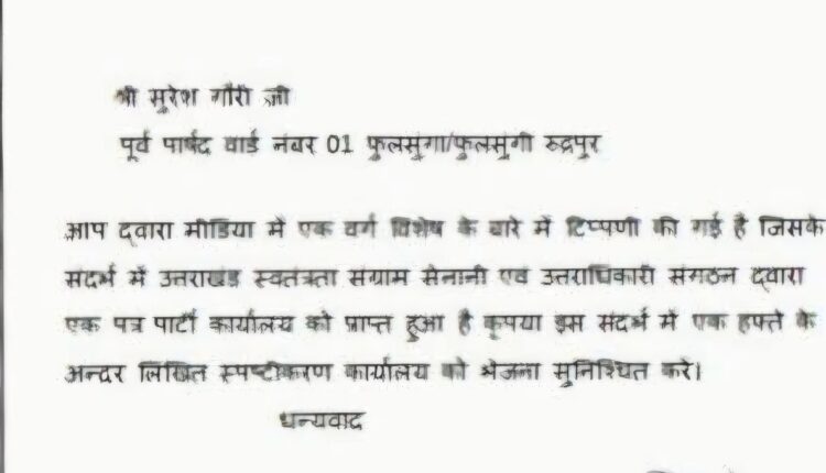 रुद्रपुर। भाजपा नेता और निवर्तमान पार्षद सुरेश गौरी के बयान को लेकर हो रहे हंगामे के बाद भाजपा जिला संगठन ने भी मामले का संज्ञान लिया है। जिलाध्यक्ष ने गौरी को नोटिस जारी कर एक हफ्ते में लिखित स्पष्टीकरण देने के निर्देश दिए हैं।