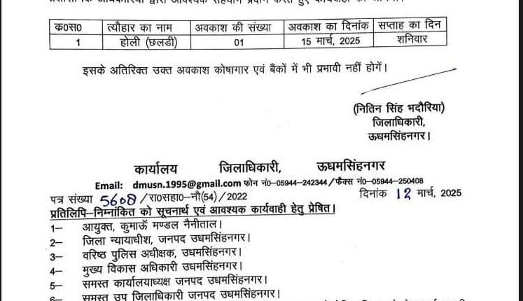 इसके अनुसार, 15 मार्च 2025 को होली (छलडी) के अवसर पर जिले में स्थानीय अवकाश रहेगा। यह अवकाश मैनुअल आफ गवर्नमेन्ट आर्डर्स (संशोधित) 1881 के पैरा-247 में दिए गए अधिकारों के तहत घोषित किया गया है।