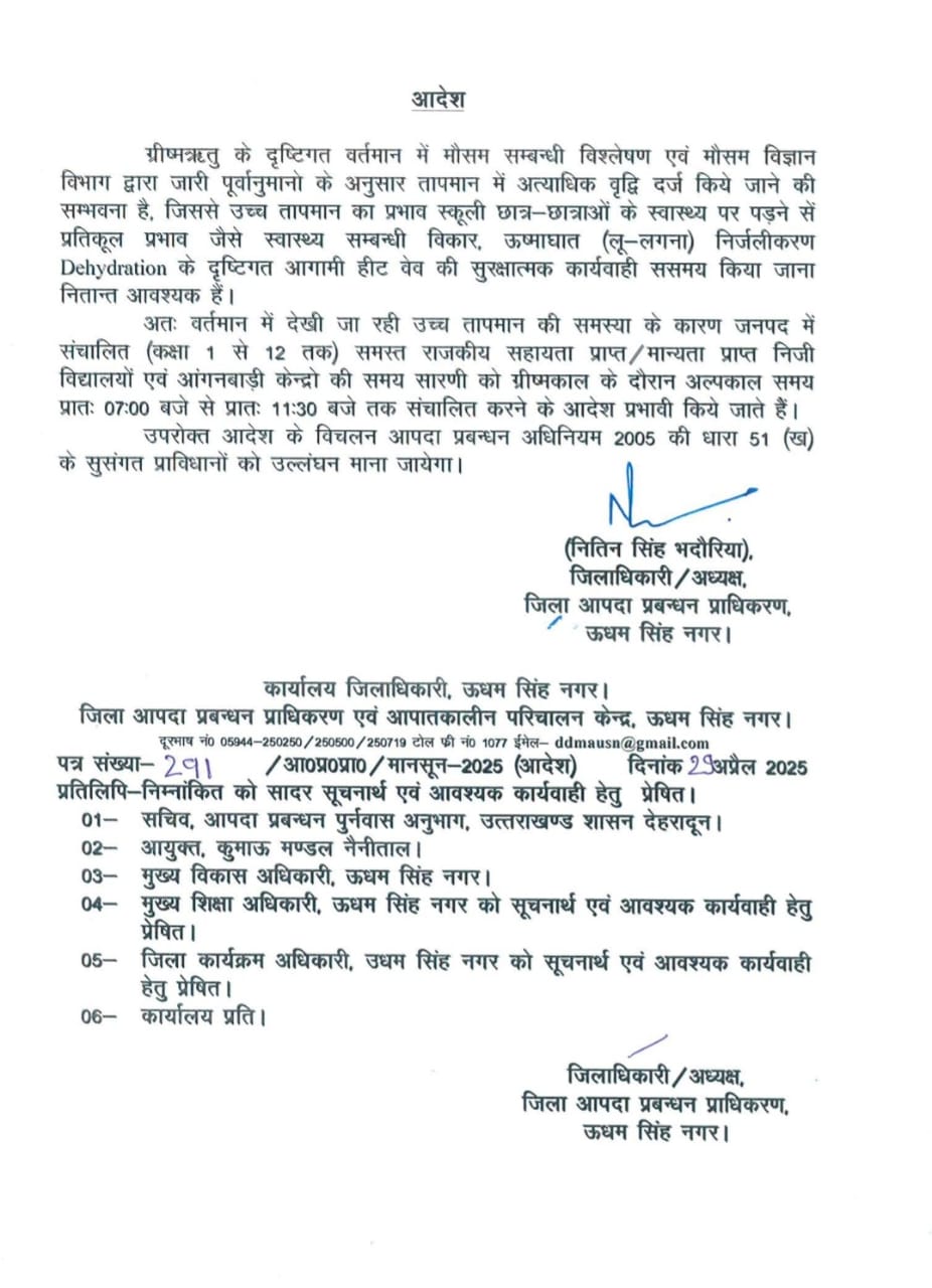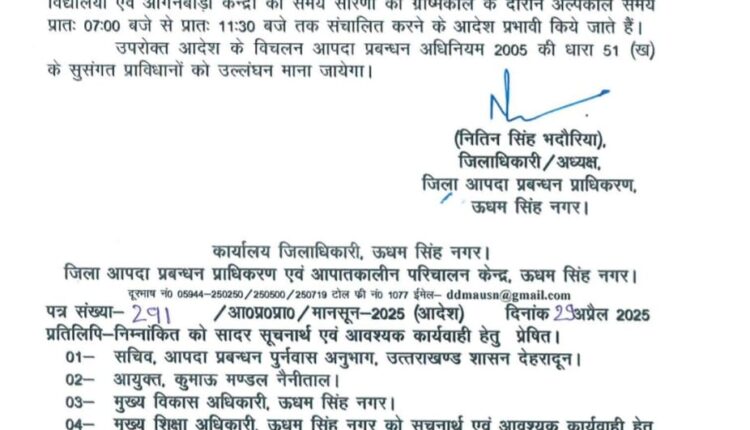 उधमसिंह नगर। भीषण गर्मी और संभावित हीट वेव को देखते हुए जिलाधिकारी एवं जिला आपदा प्रबंधन प्राधिकरण अध्यक्ष नितिन सिंह भदौरिया ने जिले के सभी स्कूलों और आंगनबाड़ी केंद्रों के समय में परिवर्तन के आदेश जारी किए हैं। मौसम विभाग के पूर्वानुमान और तापमान में निरंतर वृद्धि को देखते हुए यह निर्णय लिया गया है, ताकि स्कूली बच्चों के स्वास्थ्य को गर्मी से होने वाले दुष्प्रभावों—जैसे लू लगना, डिहाइड्रेशन और अन्य बीमारियों—से बचाया जा सके।