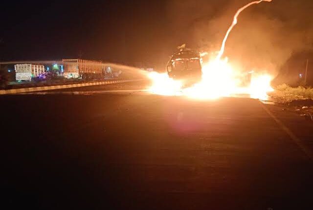 इस बीच पीछे से तेज गति से आ रहे मिट्टी से भरे डंपर स्टेयरिंग की रॉड निकलने से अनियंत्रित हो गया। डंपर चालक मुराद ने संभालने की कोशिश की, वह ट्रक में घुस गया। टक्कर लगने से ट्रक का डीजल टैंक फट गया और आग लग गई। देखते ही देखते आग ने भीषण रूप धारण कर लिया। ट्रक चालक ने बमुश्किल केबिन से कूदकर अपनी जान को बचाया, वहीं डंफर चालक मुराद अली फरार हो गया।