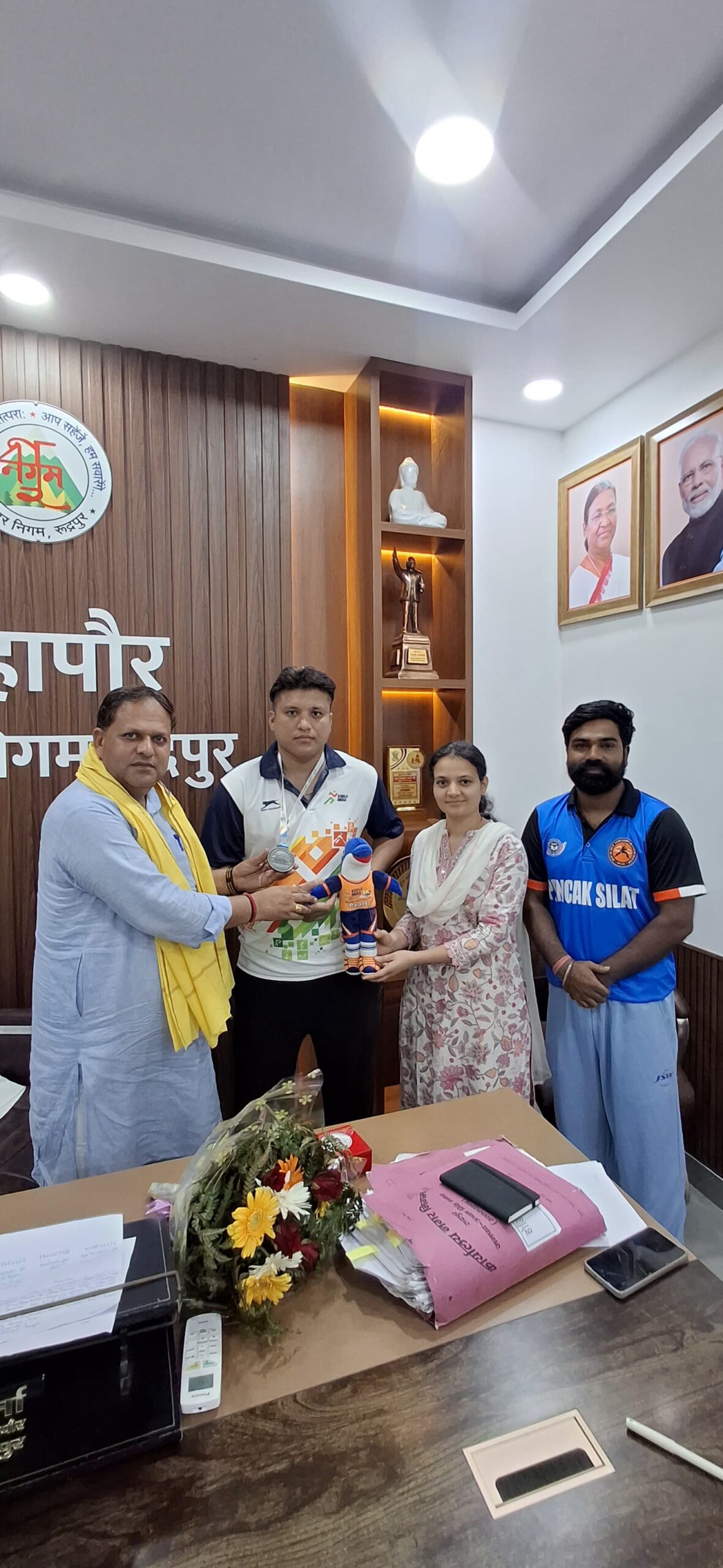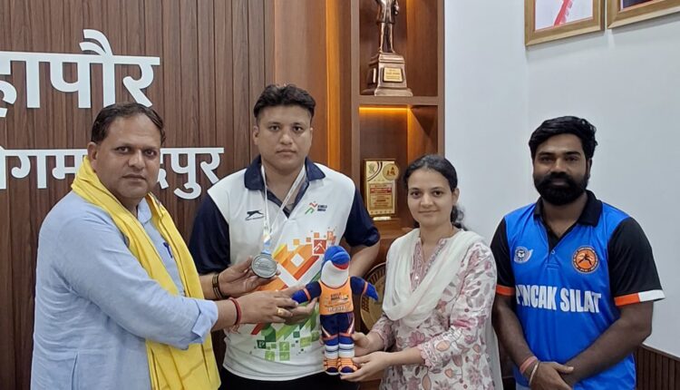 रूद्रपुर। महापौर विकास शर्मा ने पेंचक सिलाट प्रतियोगिता में मेडल जीतकर लौटे पीएसी के जवान हेमंत सिंह खनायत का अपने कार्यालय में स्वागत करते हुए स्मृति चिन्ह देकर सममानित किया।