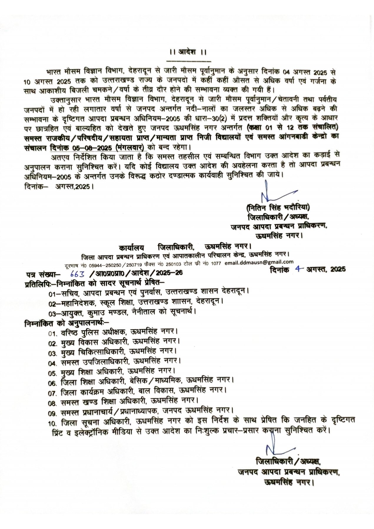 रुद्रपुर। भारत मौसम विज्ञान विभाग, देहरादून द्वारा 4 अगस्त को जारी मौसम पूर्वानुमान के अनुसार आगामी 10 अगस्त तक उत्तराखंड राज्य के विभिन्न क्षेत्रों में कहीं-कहीं भारी से बहुत भारी वर्षा और गरज के साथ बिजली चमकने की संभावना जताई गई है। इस अलर्ट को ध्यान में रखते हुए जिला प्रशासन ऊधमसिंह नगर ने एहतियातन 5 अगस्त 2025 (मंगलवार) को जिले के कक्षा 1 से 12 तक के सभी सरकारी, गैर सरकारी, सहायता प्राप्त, निजी विद्यालय एवं आंगनबाड़ी केंद्रों को बंद रखने के आदेश जारी किए हैं।