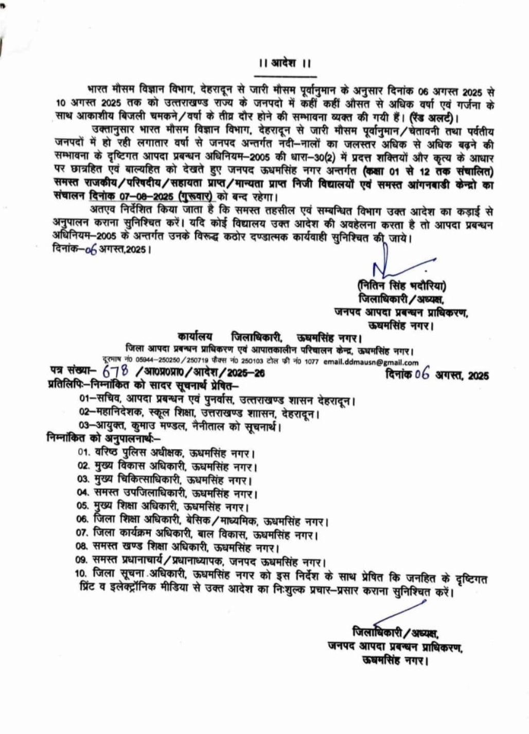 प्राप्त चेतावनी को गंभीरता से लेते हुए जिलाधिकारी ने बताया कि पर्वतीय क्षेत्रों में लगातार हो रही बारिश के कारण नदियों-नालों के जलस्तर में वृद्धि की आशंका है। संभावित आपदा के दृष्टिगत आपदा प्रबंधन अधिनियम-2005 की धारा 30(2) के तहत प्राप्त अधिकारों का प्रयोग करते हुए जनपद उधमसिंह नगर के समस्त विद्यालयों (कक्षा 1 से 12 तक) एवं सभी आंगनबाड़ी केन्द्रों को 07 अगस्त 2025 (गुरुवार) को बंद रखने का आदेश जारी किया गया है।