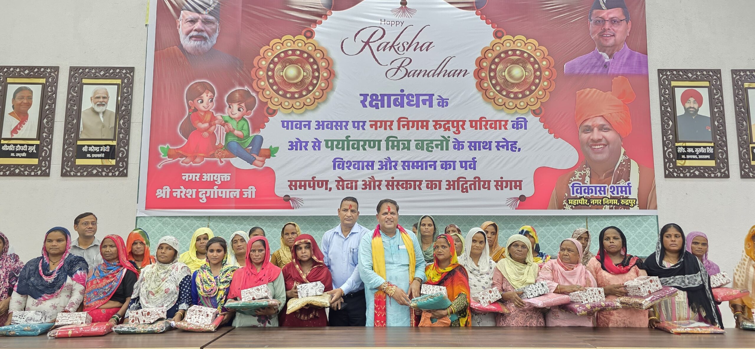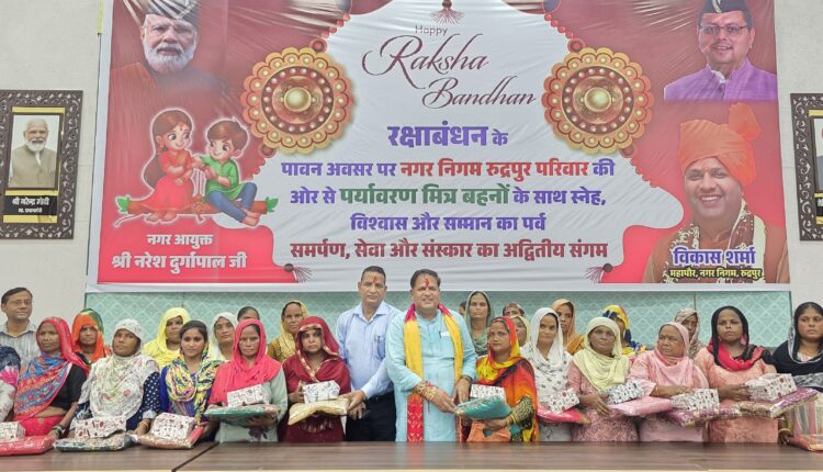 रुद्रपुर। नगर निगम सभागार में गुरुवार को रक्षाबंधन का पर्व परंपरागत रीति-रिवाजों और हर्षाेल्लास के साथ मनाया गया। इस विशेष अवसर पर नगर निगम की महिला कर्मचारियों, पर्यावरण मित्र बहनों एवं महिला स्वयं सहायता समूहों से जुड़ी सैकड़ों महिलाओं ने महापौर विकास शर्मा और नगर आयुक्त नरेश दुर्गापाल को रक्षा सूत्र बांधकर उनके दीर्घायु एवं सुखमय जीवन की कामना की।
