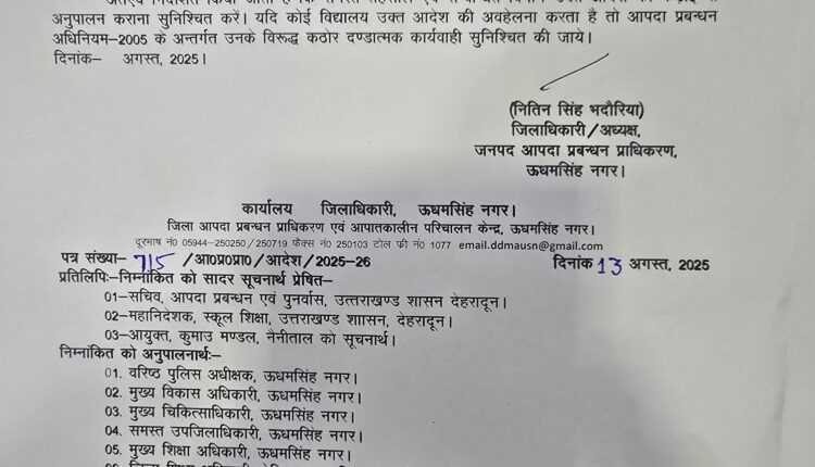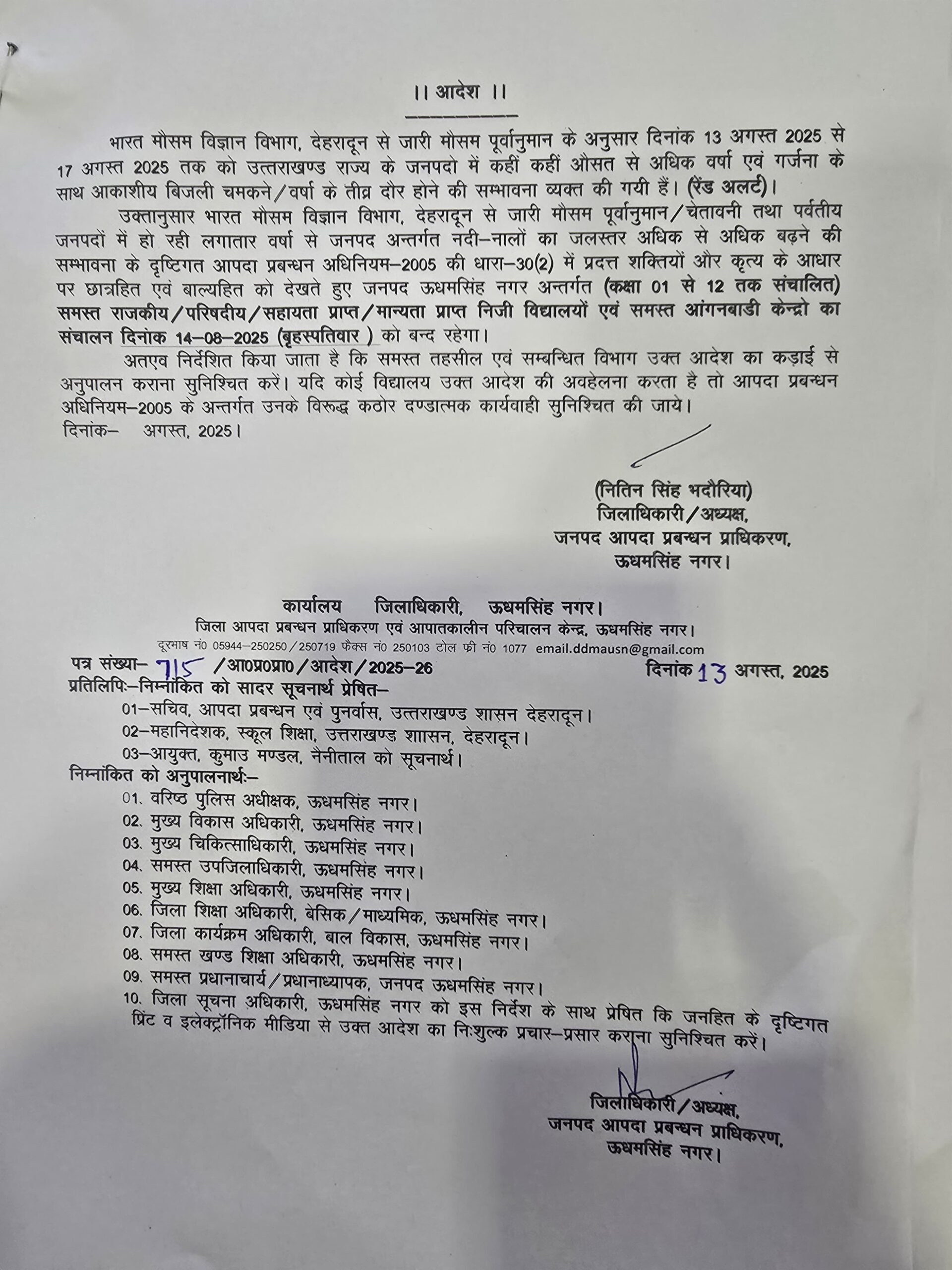 उक्तानुसार भारत मौसम विज्ञान विभाग, देहरादून से जारी मौसम पूर्वानुमान / चेतावनी तथा पर्वतीय जनपदों में हो रही लगातार वर्षा से जनपद अन्तर्गत नदी-नालों का जलस्तर अधिक से अधिक बढ़ने की सम्भावना के दृष्टिगत आपदा प्रबन्धन अधिनियम-2005 की धारा-30 (2) में प्रदत्त शक्तियों और कृत्य के आधार पर छात्रहित एवं बाल्यहित को देखते हुए जनपद ऊधमसिंह नगर अन्तर्गत (कक्षा 01 से 12 तक संचालित) समस्त राजकीय / परिषदीय / सहायता प्राप्त / मान्यता प्राप्त निजी विद्यालयों एवं समस्त आंगनबाडी केन्द्रो का संचालन दिनांक 14-08-2025 (बृहस्पतिवार) को बन्द रहेगा।