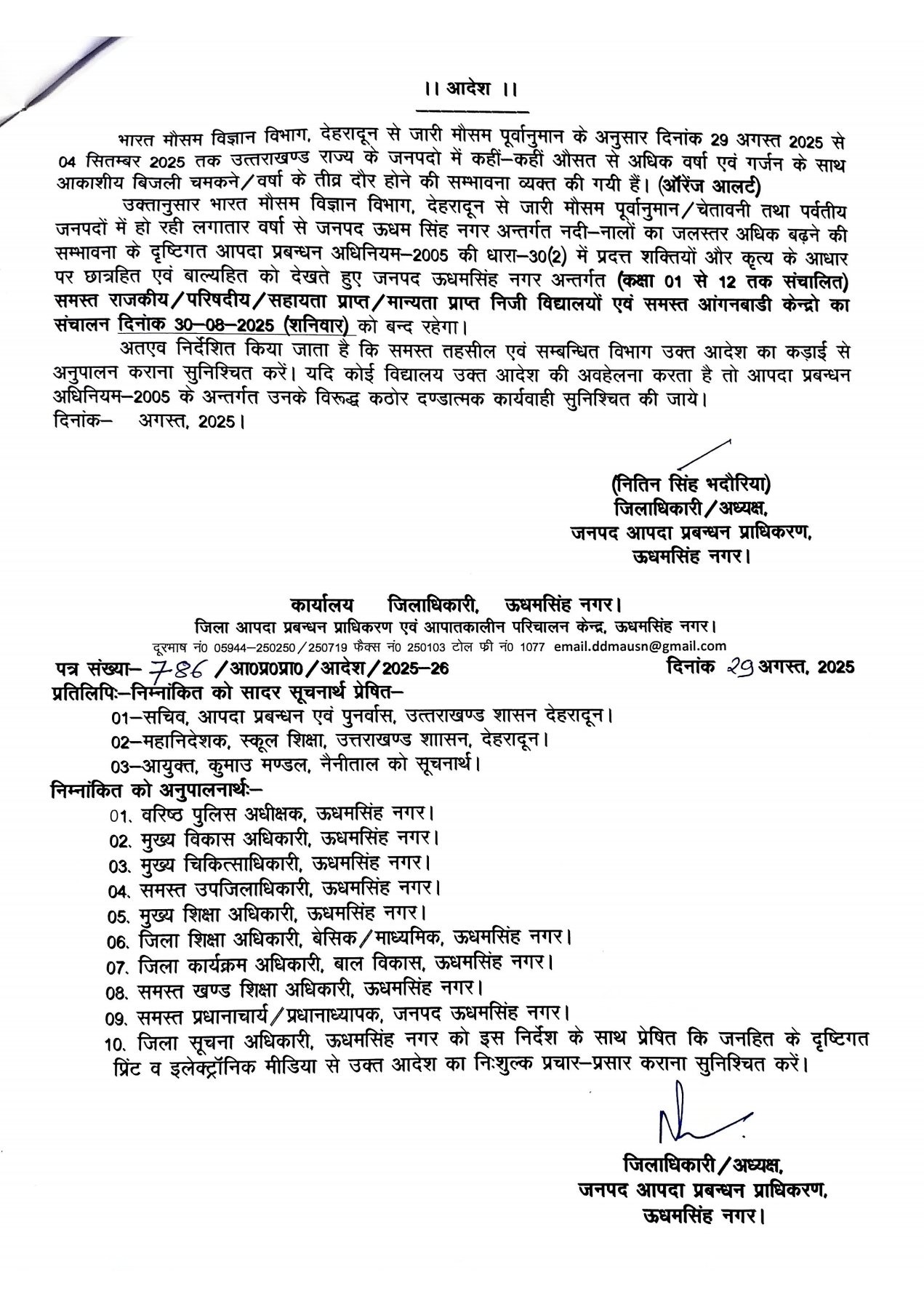 उक्तानुसार भारत मौसम विज्ञान विभाग, देहरादून से जारी मौसम पूर्वानुमान / चेतावनी तथा पर्वतीय जनपदों में हो रही लगातार वर्षा से जनपद ऊधम सिंह नगर अन्तर्गत नदी-नालों का जलस्तर अधिक बढ़ने की सम्भावना के दृष्टिगत आपदा प्रबन्धन अधिनियम-2005 की धारा-30 (2) में प्रदत्त शक्तियों और कृत्य के आधार पर छात्रहित एवं बाल्यहित को देखते हुए जनपद ऊधमसिंह नगर अन्तर्गत (कक्षा 01 से 12 तक संचालित) समस्त राजकीय/परिषदीय / सहायता प्राप्त / मान्यता प्राप्त निजी विद्यालयों एवं समस्त आंगनबाडी केन्द्रो का संचालन दिनांक 30-08-2025 (शनिवार) को बन्द रहेगा।