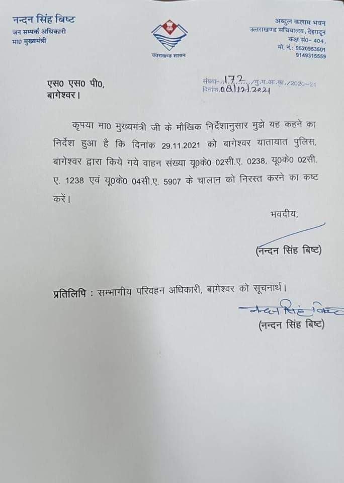 आठ दिसंबर के इस पत्र में लिखा गया है कि मुख्यमंत्री के मौखिक निर्देशानुसार 29 नवंबर को बागेश्वर यातायात पुलिस ने वाहन संख्या यूके02सीए, 0238, यूके02सीए, 1238 और यूके04सीए 5907 के चालन निरस्त करने का कष्ट करें। इसकी प्रतिलिपि संभागीय परिवहन अधिकारी बागेश्वर को भी सूचनार्थ भेजी गई है।