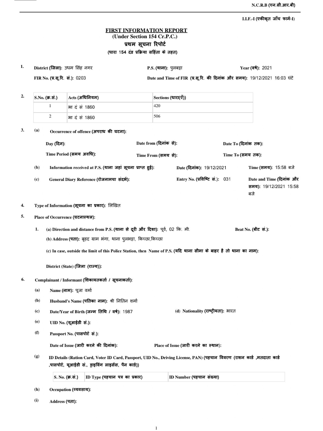 शिकायतकर्ती पूजा के अधिवक्ता गौरव कुमार मिड्डा ने बताया कि पूजा द्वारा पूर्व में पुलभट्टा थाना पुलिस को शिकायत प्रस्तुत की गई जिस पर कार्यवाही न होने पर एसएसपी को भी प्रार्थना पत्र दिया गया से लेकिन उस पर भी कोई कार्यवाही नहीं की गई। जिस पर न्यायालय के समक्ष मामले को रखा गया। न्यायालय के आदेश पर पुलभट्टा थाना पुलिस ने आरोपी विपिन के खिलाफ धारा 420/506 आईपीसी में मामला दर्ज किया गया है।