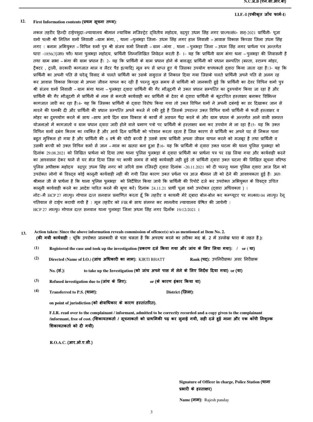 पूजा का कहना है कि पति से घरेलू विवाद के चलते उसे ससुराल से निकाल दिया गया। जिसके पश्चात वह पति से अलग आवास विकास किच्छा में अपना जीवन यापन कर रही है। परंतु कुछ समय से उसे जानकारी मिल रही है उसका देवर विपिन शर्मा पुत्र संजय शर्मा निवासी ग्राम भंगा पुलभट्टा द्वारा उसकी गैर मौजूदगी में प्रधान संपत्ति का दुरुपयोग किया जा रहा है और उसके नाम से कागजी कार्रवाई कर उसके कूट रचित हस्ताक्षर बनाकर विभिन्न कागजात जारी कर रहा है।