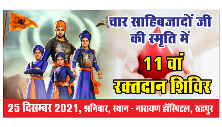 रुद्रपुर। क्षेत्र के युवा नेताओं लखबीर सिंह लक्खा एवं सुशील गाबा सहित तमाम युवाओं ने आज 11वां विशाल रक्तदान शिविर नारायण हॉस्पिटल एवं ट्रामा सेंटर बिलासपुर रोड पर आयोजित किया गया। चार साहिबजादों की पावन स्मृति को समर्पित इस रक्तदान शिविर में दर्जनों युवाओं नें रक्तदान कर दसवें गुरु गोबिंद सिंह के साहिबज़ादे बाबा अजीत सिंह जी, बाबा जुझार सिंह जी, बाबा ज़ोरावर सिंह जी और बाबा फतेह सिंह जी को भावभीनी श्रधान्जली अर्पित की ।