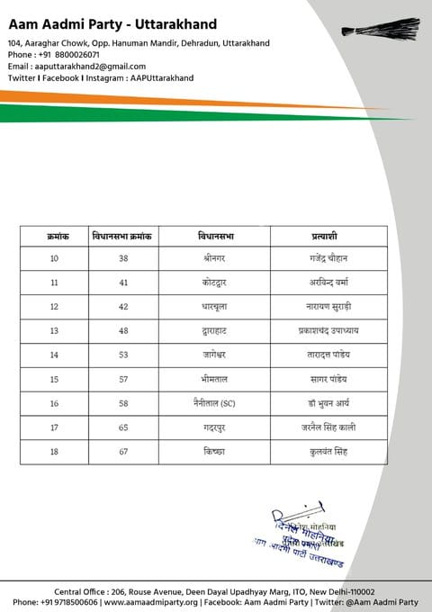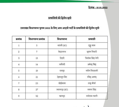 इसके साथ ही जिन उम्मीदवारों का चुनाव हुआ है उनको दिनेश मोहनिया ने बधाई दी। दूसरी सूची में 18 प्रत्याशियों के नाम हैं। रायपुर विधानसभा से नवीन प्रिशाली को प्रत्याशी बनाया गया है। घाट आंदोलन के नेता गुड्डु लाल को थराली विधानसभा से प्रत्याशी बनाया गया है। अब तक आम आदमी पार्टी ने 42 प्रत्याशी घोषित किए हैं।