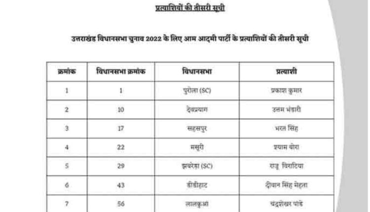 उत्तराखंड : आम आदमी पार्टी ने की अपने प्रत्याशियों की तीसरी सूची जारी, जानिये सीएम धामी के विधानसभा क्षेत्र से बतौर प्रत्याशी चुनाव मैदान में किसे उतारा ……