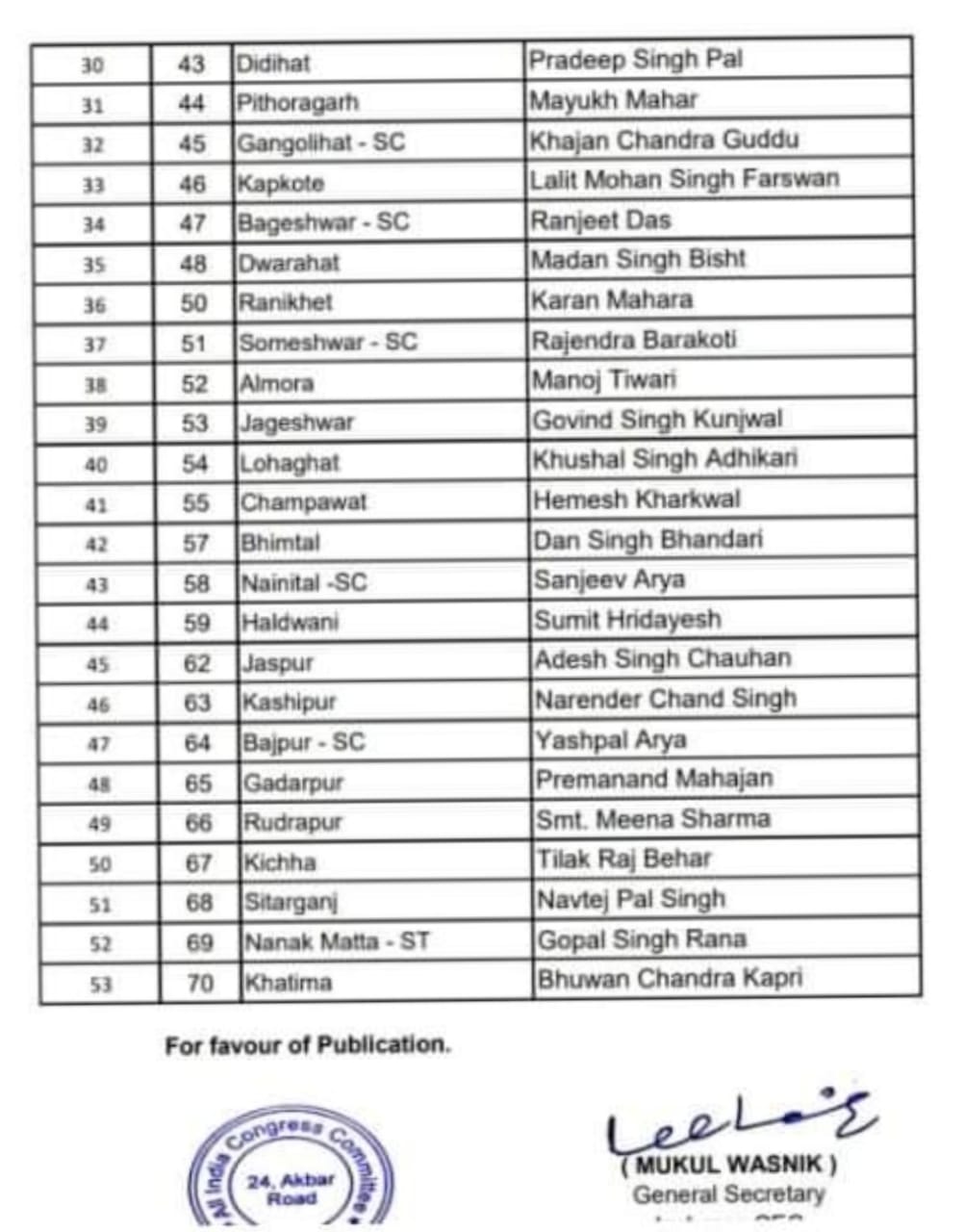 केदारनाथ से मनोज रावत, चकराता से प्रीतम सिंह, भगवानपुर से ममता राकेश, पिरान कलियर से फुरकान अहमद, मंगलौर से काजी निजामुद्दीन, धारचूला से हरीश धामी, रानीखेत से करण महरा, जागेश्वर से गोविंद सिंह कुंजवाल, जसपुर से आदेश चौहान के नाम शामिल हैं।