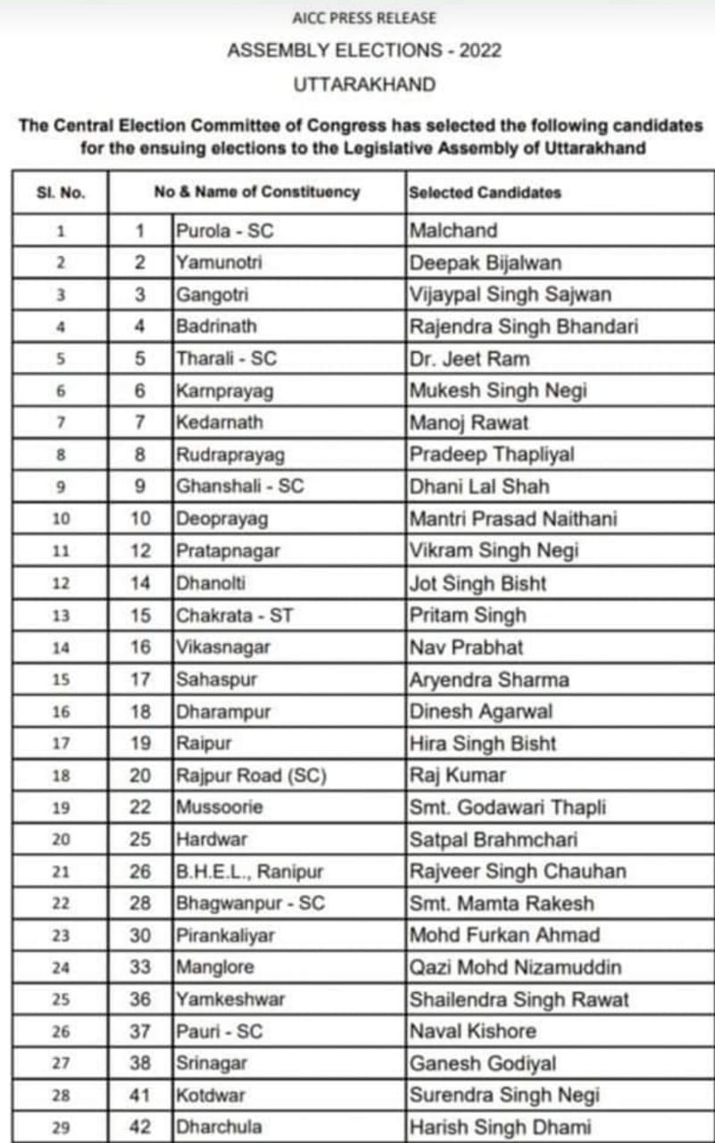 उत्तराखंड : कांग्रेस ने अपने प्रत्याक्षियों की सूची की जारी, जानिये कौन किस सीट से बनाया गया प्रत्याक्षी।