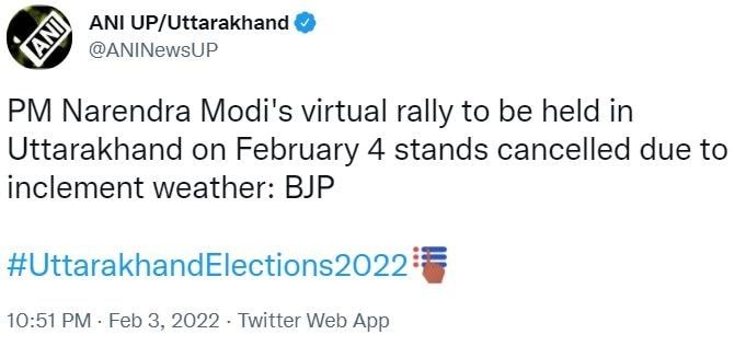 देहरादून। चुनावी राज्य उत्तराखंड में प्रधानमंत्री नरेंद्र मोदी की डिजिटल रैलियां 4 फरवरी को होने वाली थीं, लेकिन उत्तराखंड में खराब मौसम के चलते यहां रैली रद्द कर दी गई।
