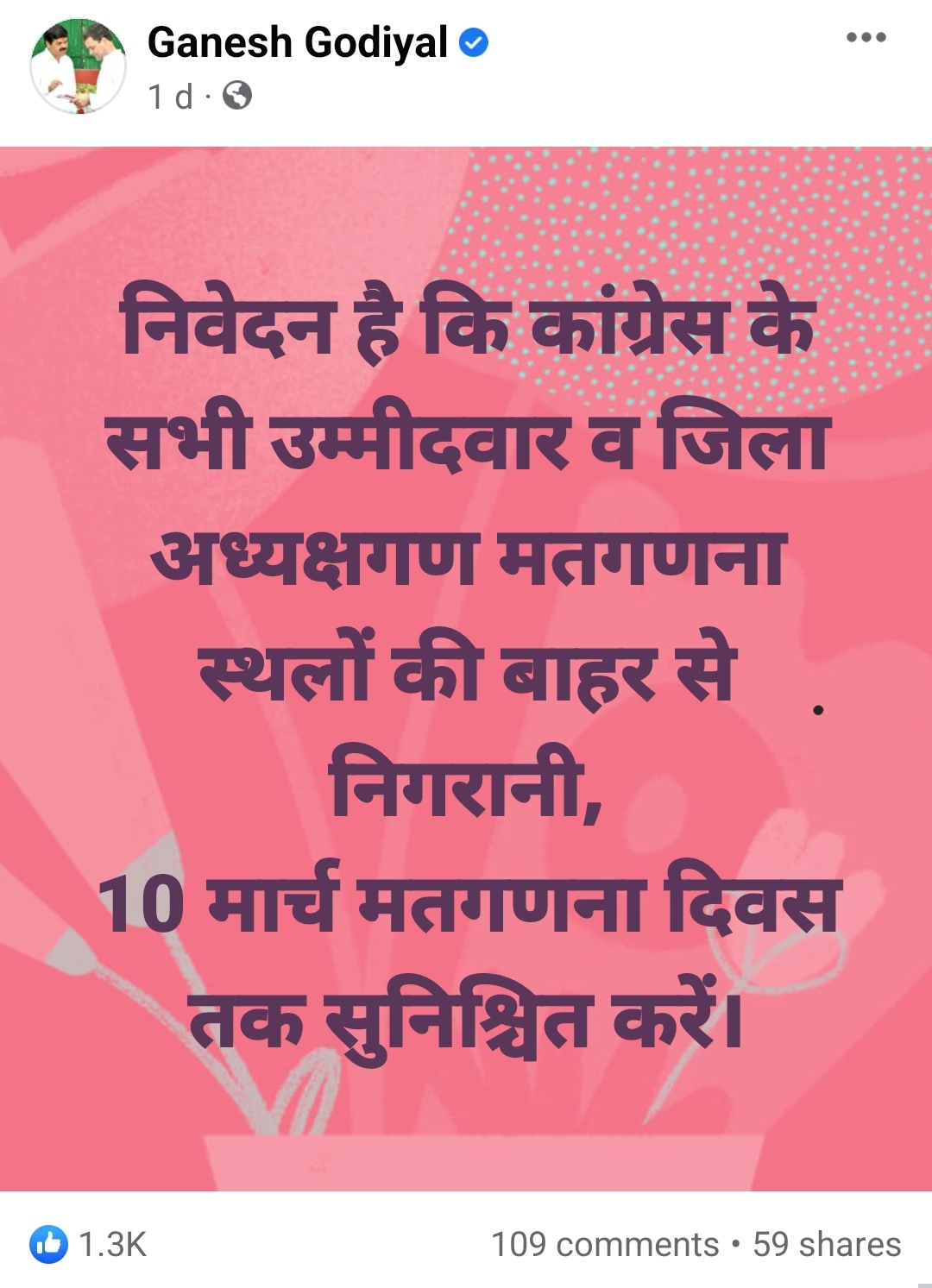 फिलहाल सभी इवीएम मशीनें मतगणना केंद्रों पर कड़ी सुरक्षा के बीच रखी गई है। उसके बावजूद प्रदेश अध्यक्ष गणेश गोदियाल की फेसबुक पोस्ट से लगता है कि पार्टी को किसी तरह की गड़बड़ी की आशंका है।