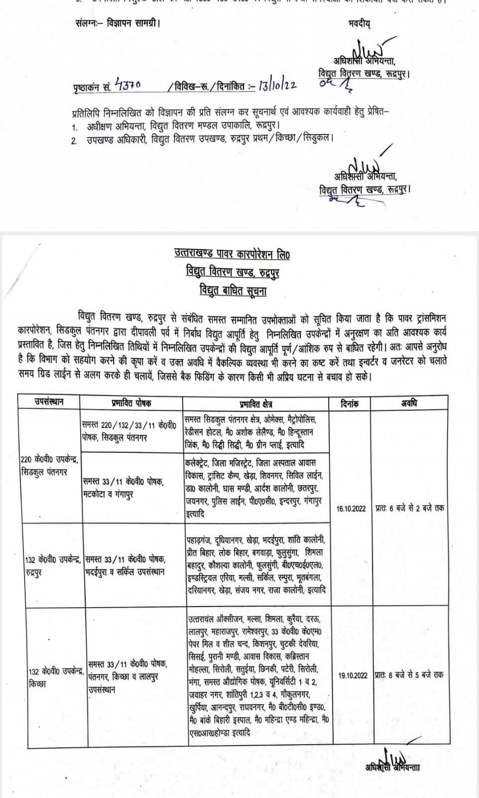 रुद्रपुर। दीपावली पर्व पर विद्युत आपूर्ति में किसी तरह की परेशानी एवं खराबी का सामना ना करना पड़े इसके लिए उत्तराखंड पावर कारपोरेशन विद्युत वितरण खंड रुद्रपुर द्वारा समय से ही कमर कस ली है। उत्तराखंड पावर कारपोरेशन विद्युत वितरण खंड रुद्रपुर के अधिशासी अभियंता द्वारा द्वारा अधीक्षण अभियंता एवं उपखंड अधिकारी विद्युत वितरण उपखंड रुद्रपुर को आदेश जारी कर कहां है कि 16 अक्टूबर 2022 को सिडकुल पंतनगर रुद्रपुर मैं सुबह 6:00 बजे से 2:00 बजे तक विद्युत आपूर्ति बंद रहेगी, वही पंतनगर कितना और लालपुर के उप संस्थान में 19 अक्टूबर 2022 को प्रातः 8:00 से 5:30 तक विद्युत आपूर्ति बंद रहेगी।