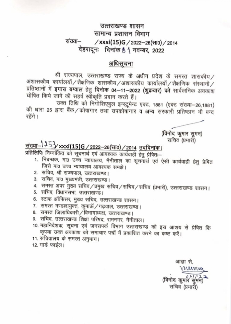 उत्तराखण्ड में इगास बग्वाल पर्व के अवसर पर सार्वजनिक अवकाश रहेगा। मुख्यमंत्री पुष्कर सिंह धामी द्वारा इगास पर सार्वजनिक अवकाश घोषित करने के बाद शासन ने इस संबंध में आदेश जारी कर दिए हैं।सचिव सामान्य प्रशासन विनोद कुमार सुमन द्वारा जारी आदेश के अनुसार शुक्रवार चार नवंबर को इगास बग्वाल पर्व पर सार्वजनिक अवकाश रहेगा। यह अवकाश सभी शासकीय व अशासकीय कार्यालयों, शैक्षणिक संस्थानों व कार्यालयों के साथ ही बैंक, कोषागार व उपकोषागार में भी रहेगा।