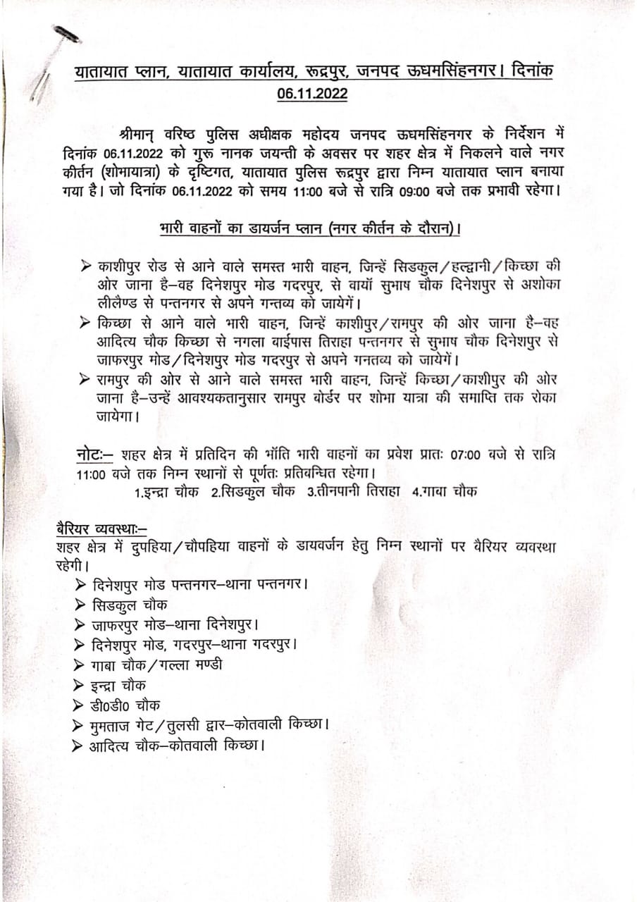 उधमसिंह नगर : रुद्रपुर में गुरु नानक जयंती के अवसर पर नगर कीर्तन के दौरान 6 नवंबर को पुलिस द्वारा भारी वाहनों की नो एंट्री और डायवर्जन प्लान।